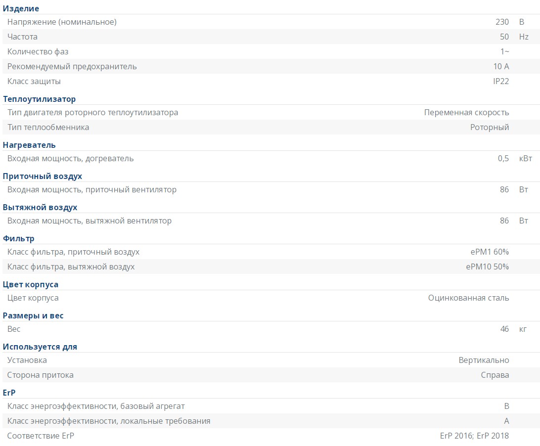 Энергоэффективные вентиляторы с ЕС-двигателями, а также фильтры низкого давления снижают потребление энергии и обеспечивают низкий коэффициент SFP (удельная мощность вентилятора) и уровень шума. Встроенный датчик влажности вытяжного воздуха можно использовать для регулирования потребления.
